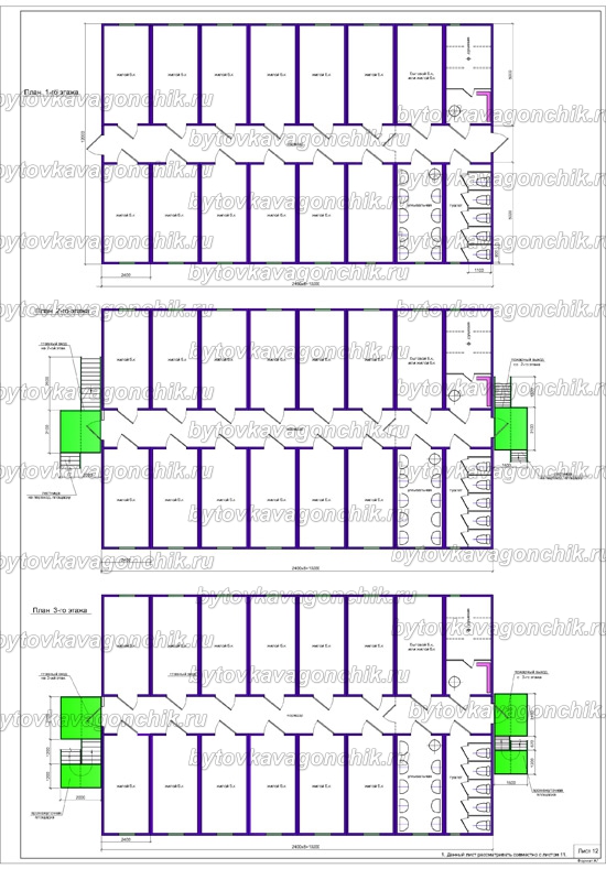 Планы трехэтажного общежития на 150 человек из 48 шт БК