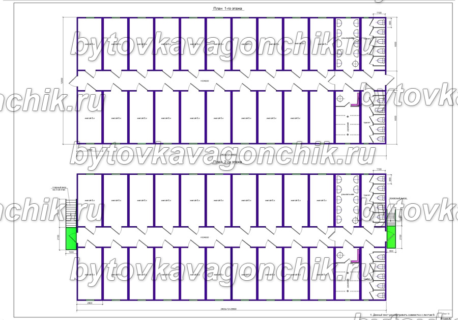Планы этажей двухэтажного общежития на 150 человек из 48 шт БК