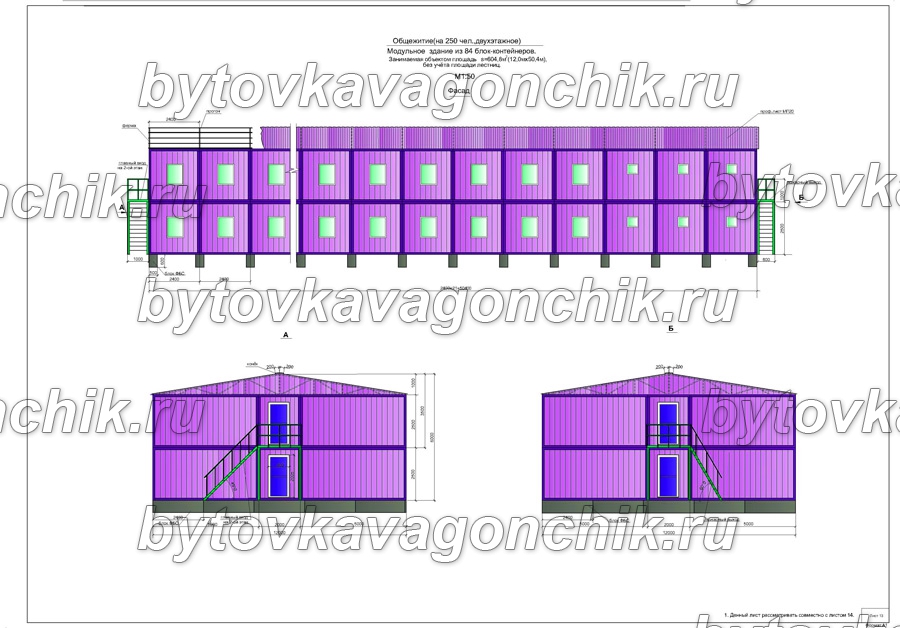 ГлавнаяПроекты готовых решенийМодульные здания → Фасады двухэтажного общежития на 250 человек из 84 шт БК