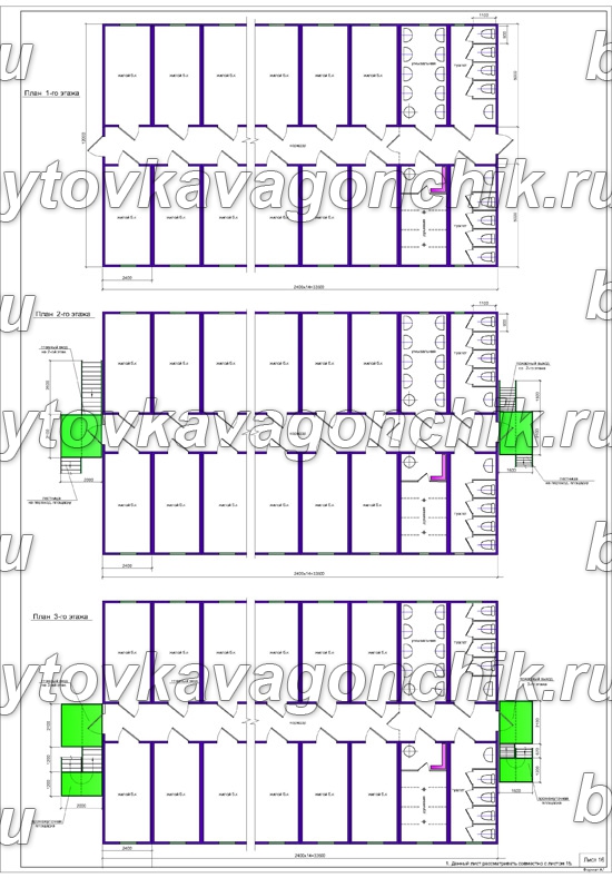 Планы трехэтажного общежития на 250 человек из 84 шт БК