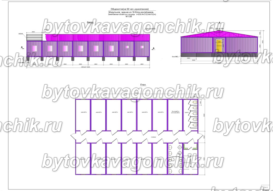 Фасады, план общежития на 50 человек, из 16 шт БК