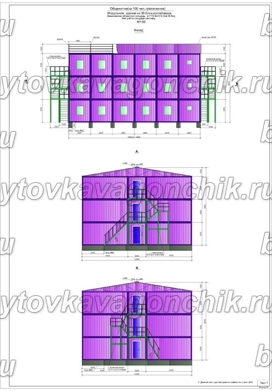 ГлавнаяПроекты готовых решенийМодульные здания → Фасады трехэтажного общежития на 100 человек из 36 шт БК